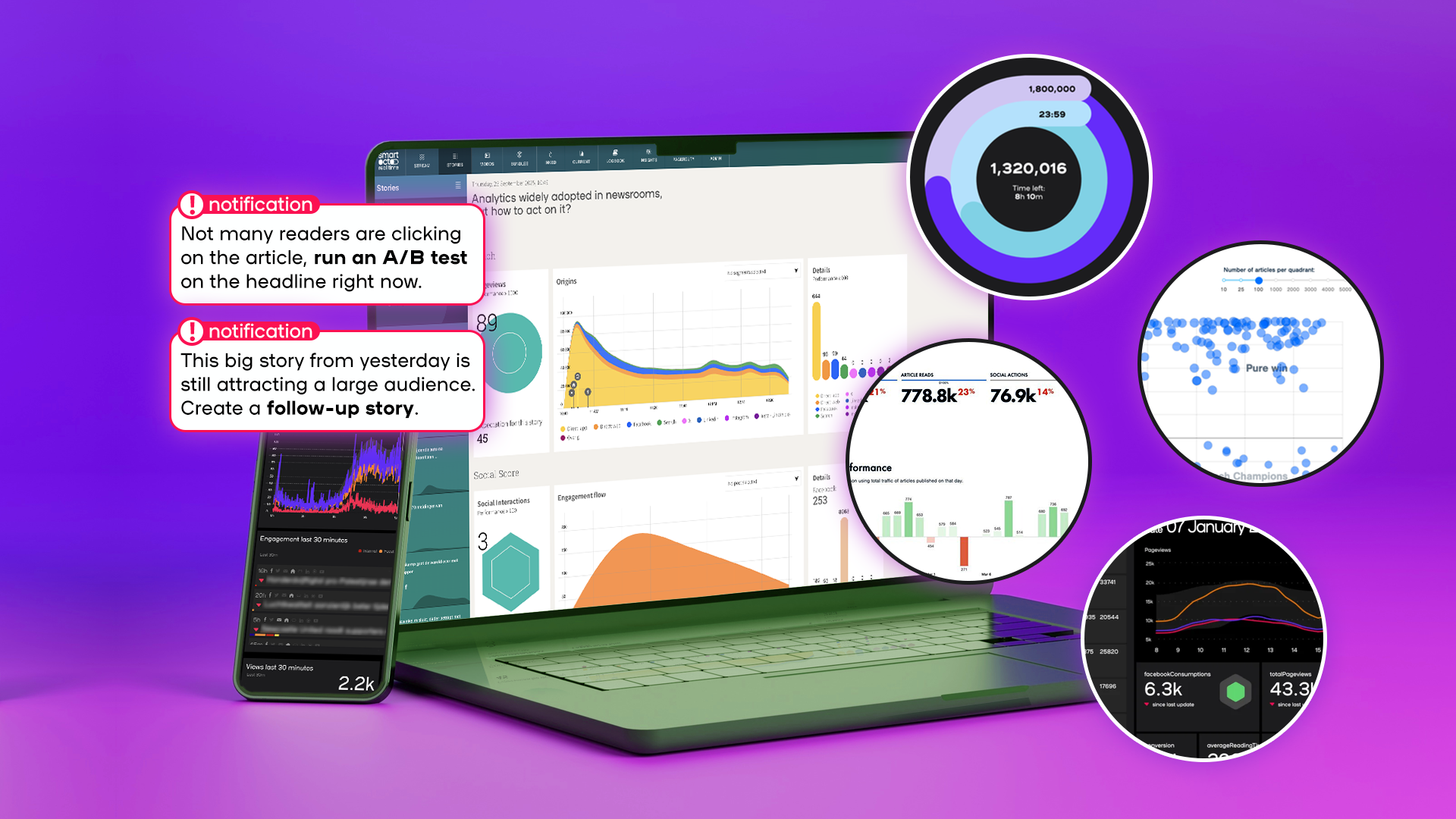It’s all about smart analytics. Data-rich insights are essential in today’s newsrooms. That’s why we invented our smart notifications. We serve you just the information you need. These unique tips are customised to you, based on your content strategy and your business model.