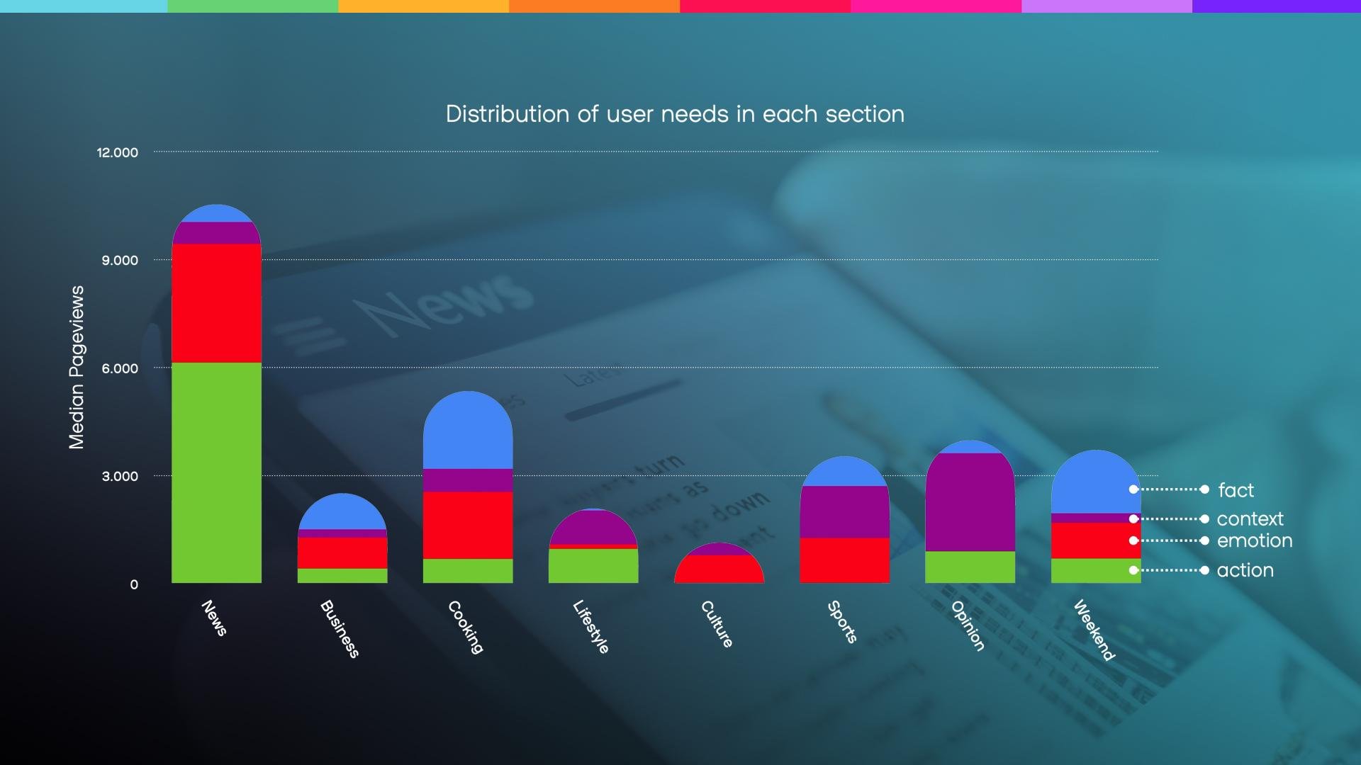 Below, you can see what becomes possible once an editorial team has seriously started implementing the user needs model and applies its own tagging on user needs. At that point, we can analyse performance across all eight user needs, or even more in theory, to identify where a newsroom’s strengths and weaknesses lie.