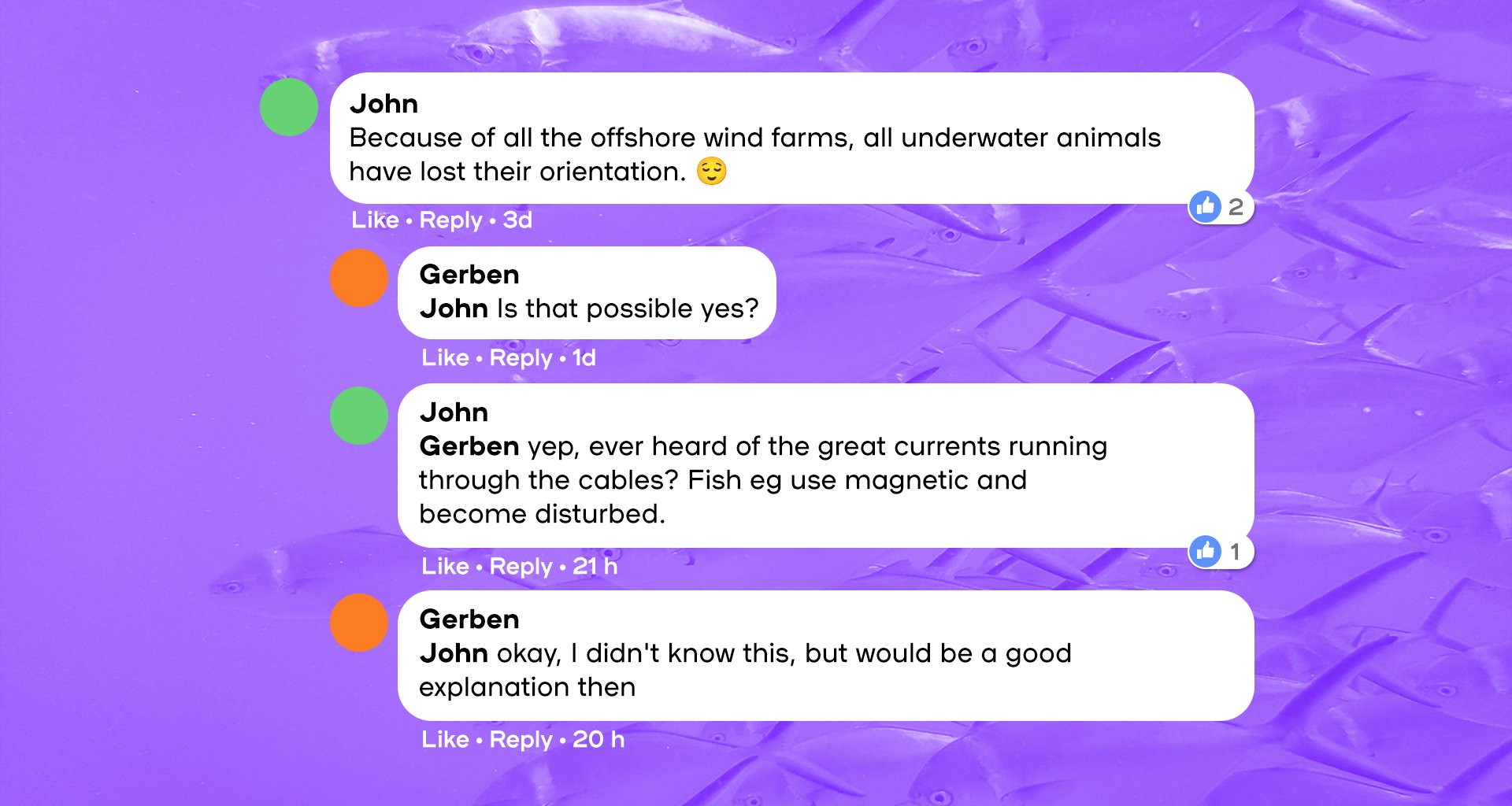 - One user on Facebook speculated that due to all the wind farms at sea, all underwater animals have lost their orientation.