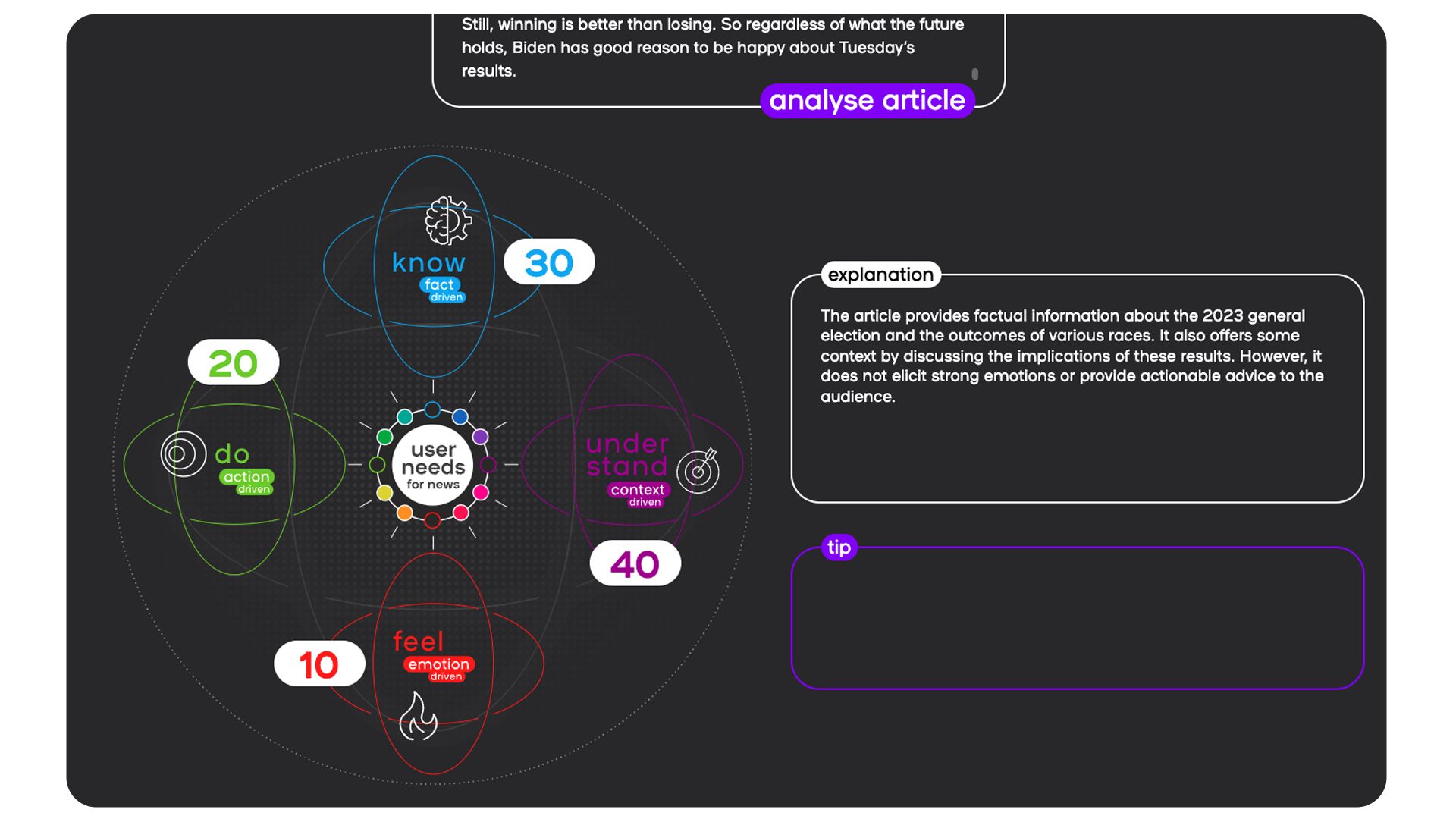 The model first scores the inputted article on a scale of 0 - 100 on each User Needs 2.0 axis, and then these scores are normalised to add up to 100.