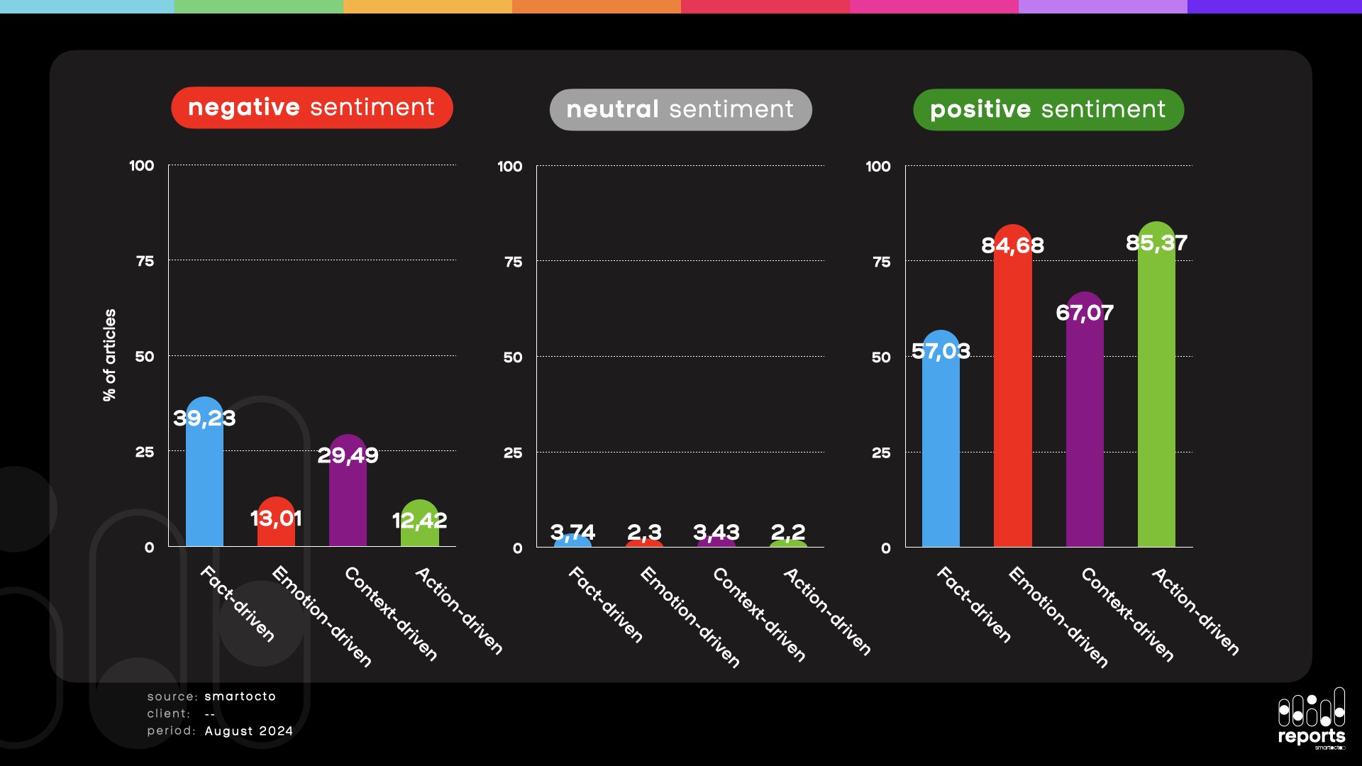 It’s clear that when examining the sentiment of news articles in this way, emotion-driven and action-driven axes have a lower percentage of negative content, while the opposite is true for fact-driven and context-driven articles in which negative content prevails. This leads us to a very important insight: namely, the shift towards more negative news is not driven equally by all user needs, with emotion-driven and action-driven articles balancing up to a certain level the negativity that is more present in hard news typically framed as fact-driven and context-driven stories.