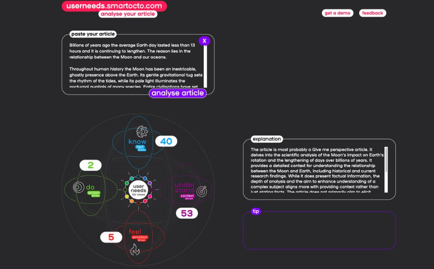 - We applied our in-house developed system for automatic tagging of user needs in news articles to score (0-100) each article on the fact-driven, context-driven, emotion-driven, and action-driven axes of the User Needs 2.0 model. The predominant User Needs axis for each article was taken to be the one with the maximum score for that article. For example, an article receiving a score of 40 on the fact-driven axis, 53 on the context-driven axis, 5 on the emotion-driven axis, and 2 on the action-driven axis, would be categorised as a context-driven article.