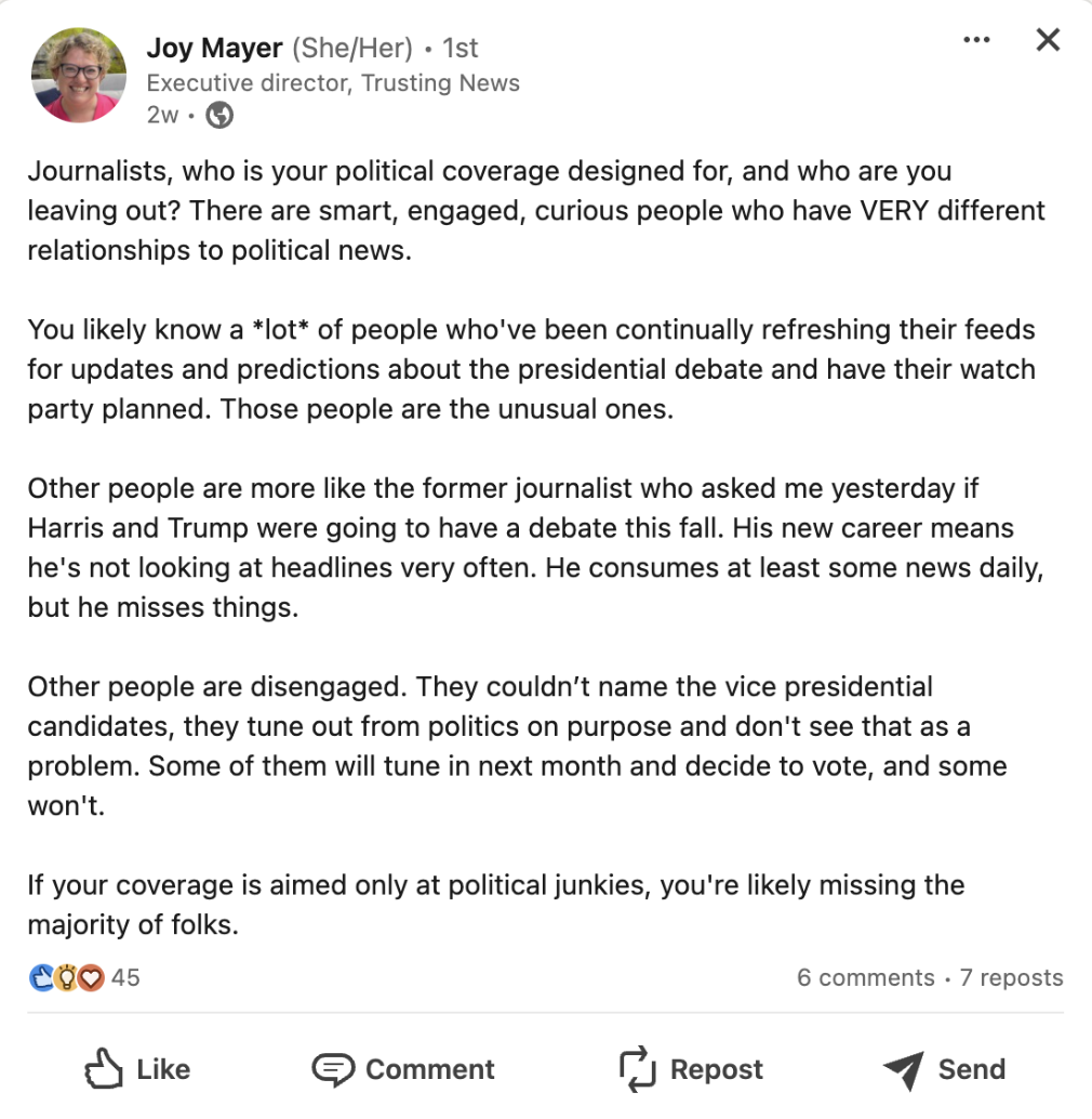 This could very well be applied to the Olympics, the ongoing crisis is Gaza or Ukraine, or indeed climate emergency. But we’re going to hang all the teachings and learnings on elections - because there’s a big one looming in the US at the moment and there’s a lot to be learned about how it’s being covered.