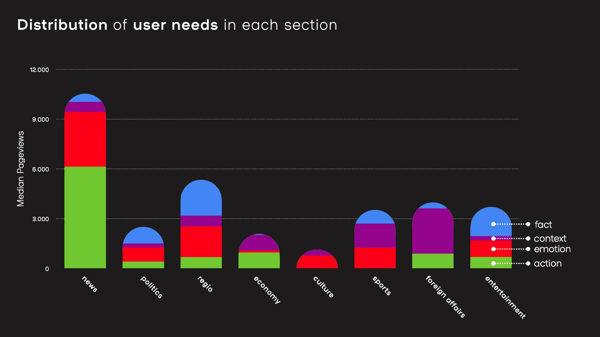 From here, you can assess your strengths and see if you can produce more from the user needs that perform well and less from those that don't resonate with your audience. For a newsroom, this is an excellent way to self-reflect. In the graph below (showing analysis from a client of smartocto), we can see that a significant amount of 'Update me' and 'Educate me' content was produced, but median pageviews were in fact higher for five other user needs.