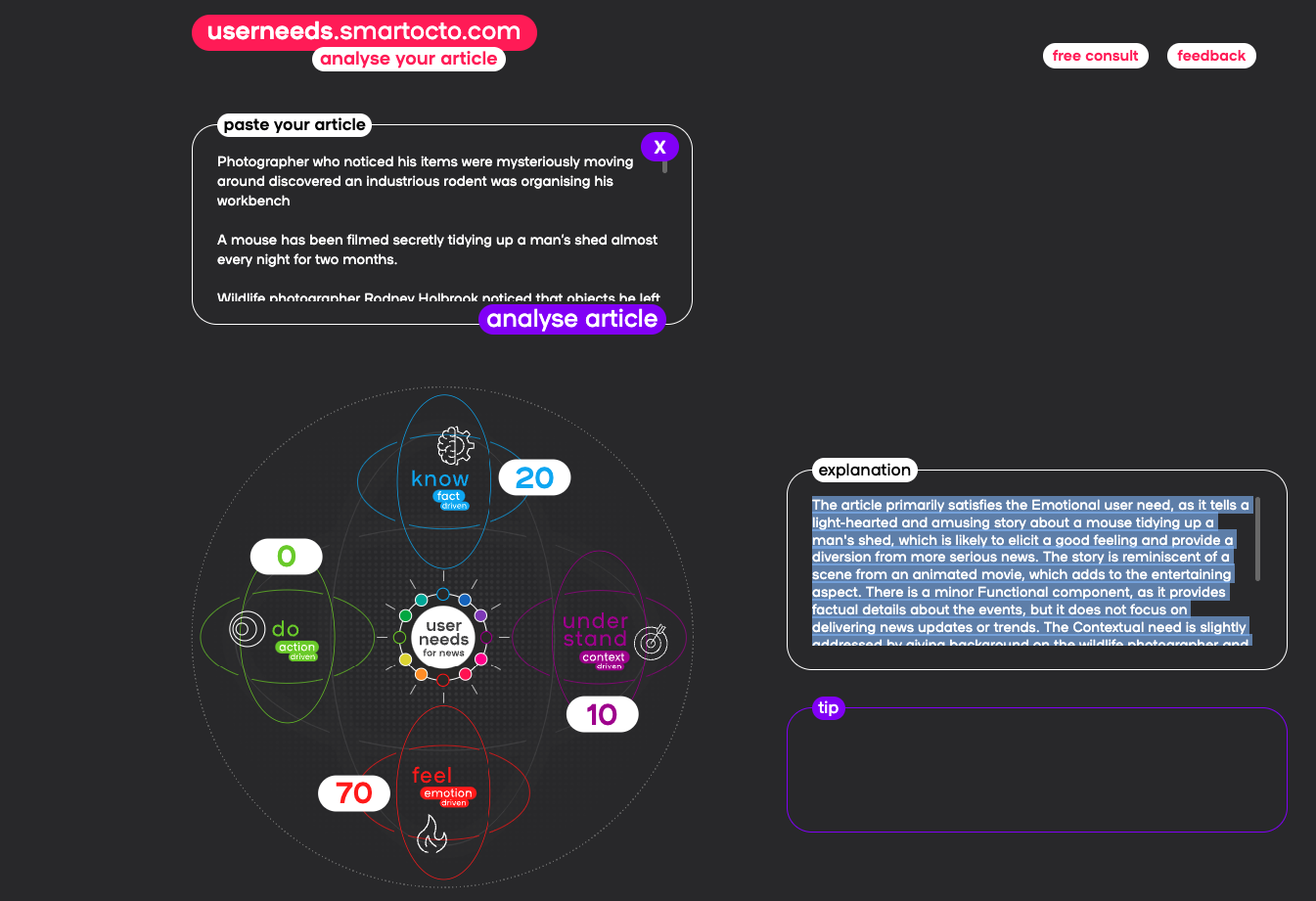 The improvement of the tool is best explained with an example. We input the following article into the user needs recogniser: