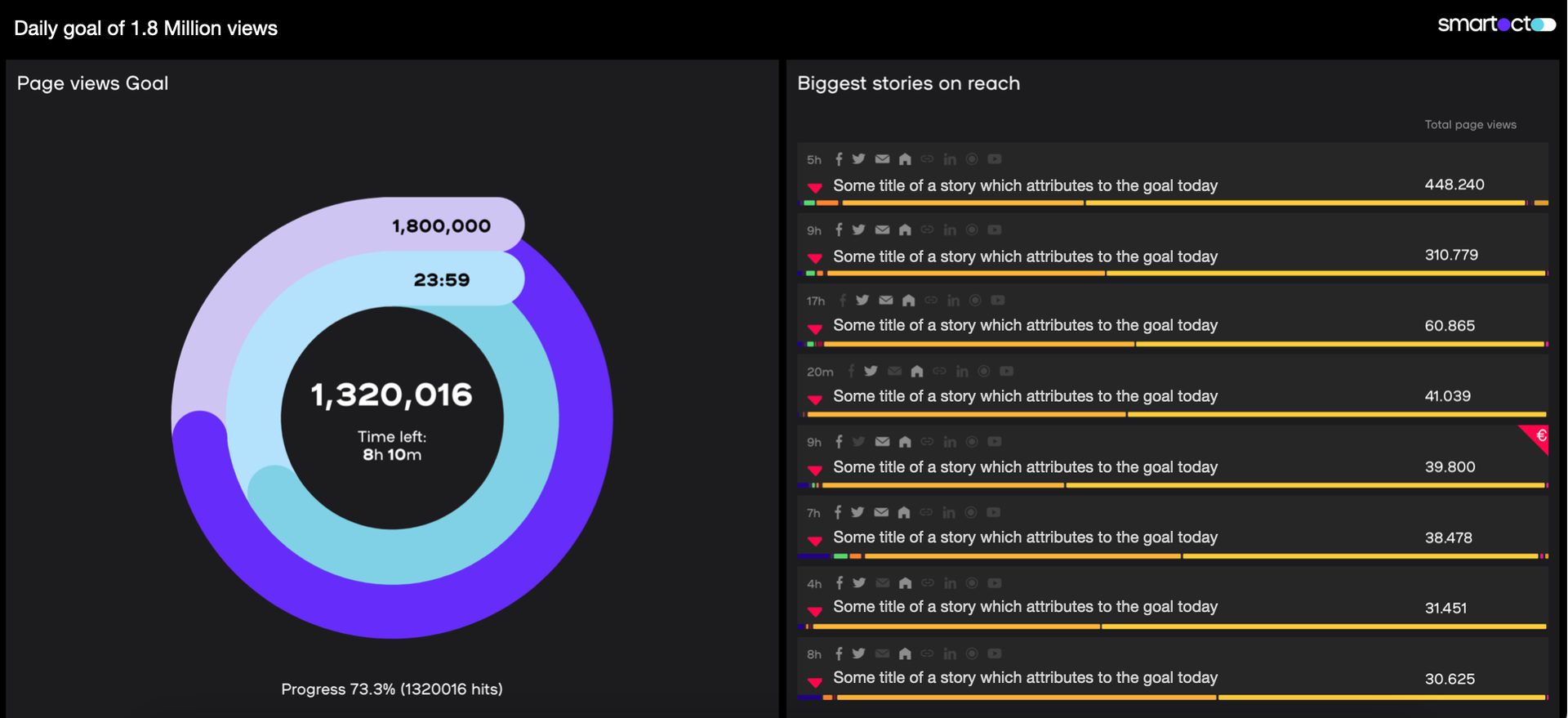 As newsrooms want to stay on top of daily, weekly, and monthly targets, they need to know when they’re doing well - and where their focus must be when they’re missing the mark. Whether it's campaign reach, conversions, subscriptions, or social traffic, smartocto Goals provides a comprehensive solution to monitor and visualise these key performance indicators.