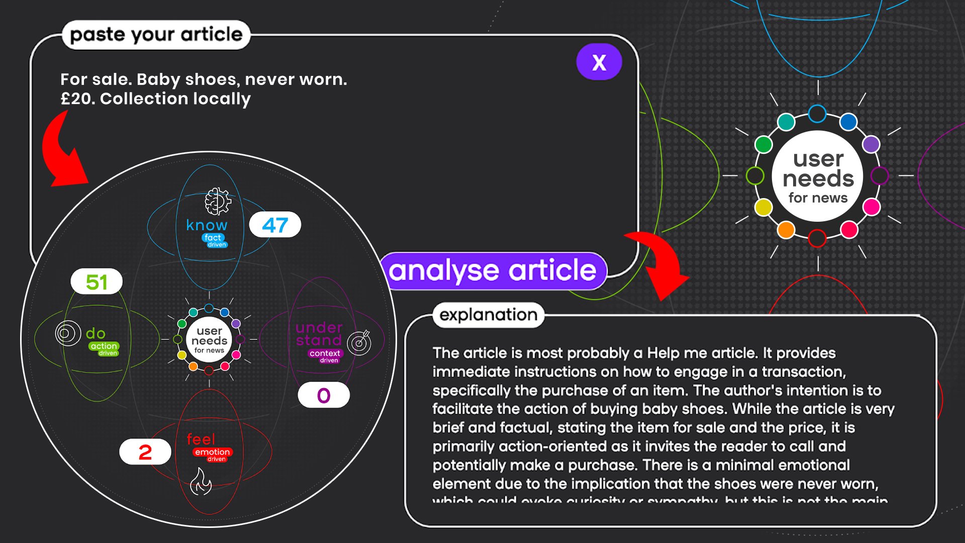 There’s a famous six word short story (attributed to Ernest Hemingway, but never confirmed to be his). Our User Needs Playground assesses this to be 100% emotional as well. This is interesting: why doesn’t it decide it’s an advert?