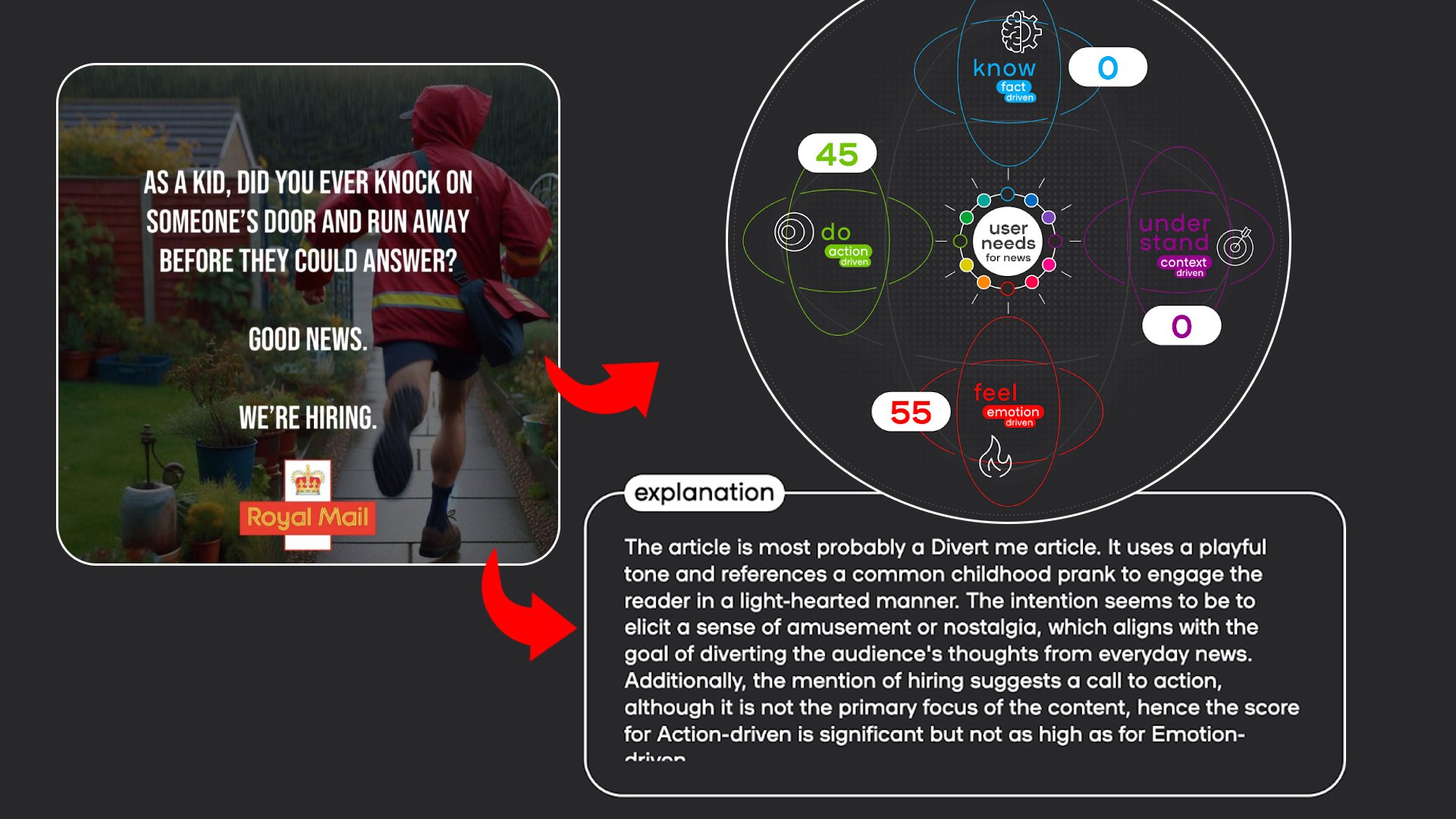 When we put the story of Little Red Riding Hood into our User Needs Playground, it returned a 100% ‘Emotion’ result. The system knew it was dealing with a certain kind of writing, that does a certain thing, a certain way. We tried it again later with a less well known fable. Same result. It’s a clever piece of kit.