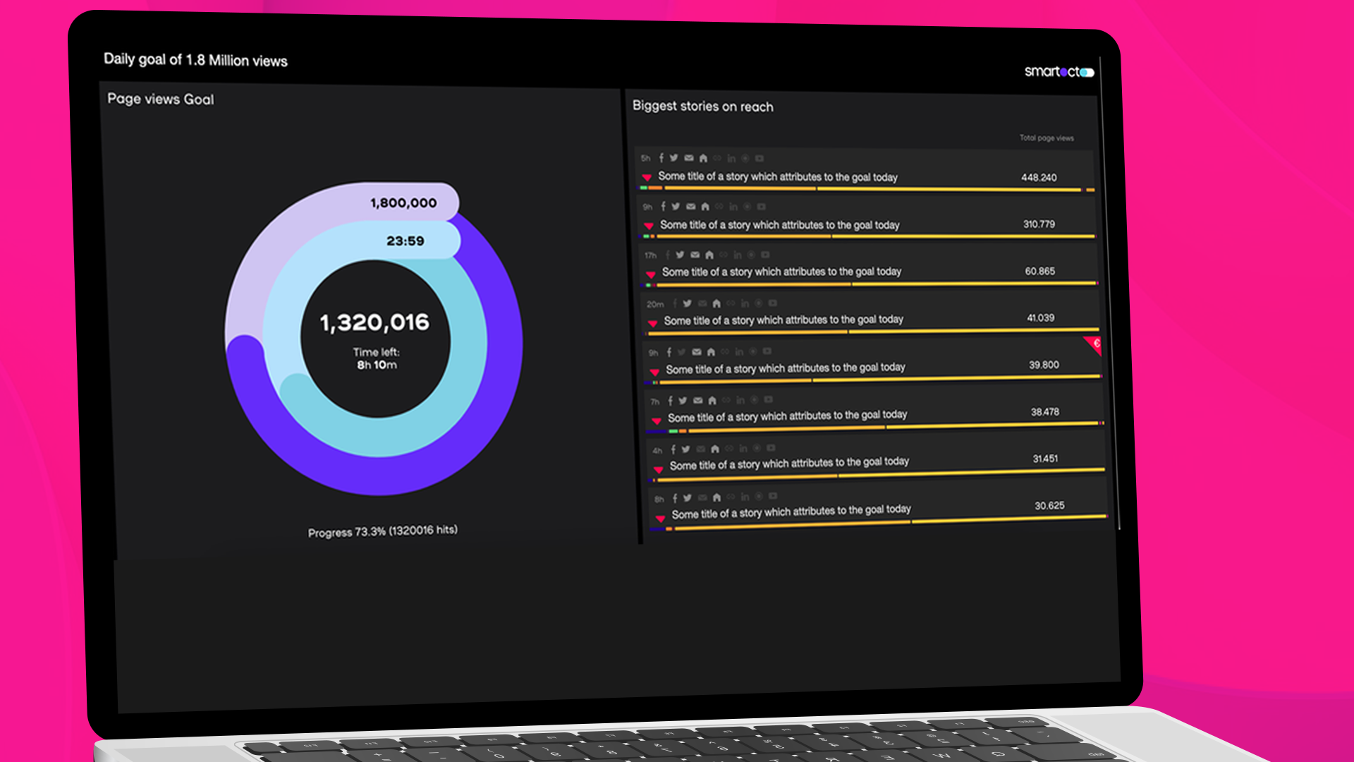Smartocto Goals enables you to set targets and track progress. It provides a comprehensive solution to monitor and visualise key performance indicators such as reach, conversions, subscriptions and social traffic.